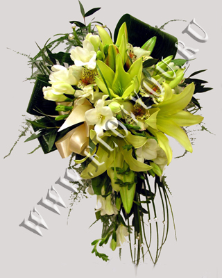 Каплевидный свадебный букет из лимонной лилии и белой фрезии.