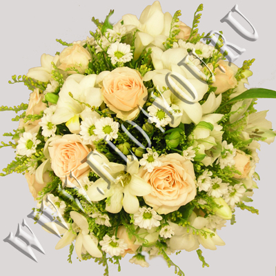 Круглый букет невесты с кремовыми кустовыми розами и фрезией.