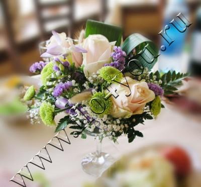 Композиция выполнена в стеклянной вазочке с использованием специальной флористической губки для сохранения свежести срезанных цветов.