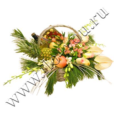 Подарочная корзина с фруктами, конфетами и мартини оформлена живыми цветами. Такая корзина – приятный подарок для Ваших партнеров и клиентов, а также друзей и родных.